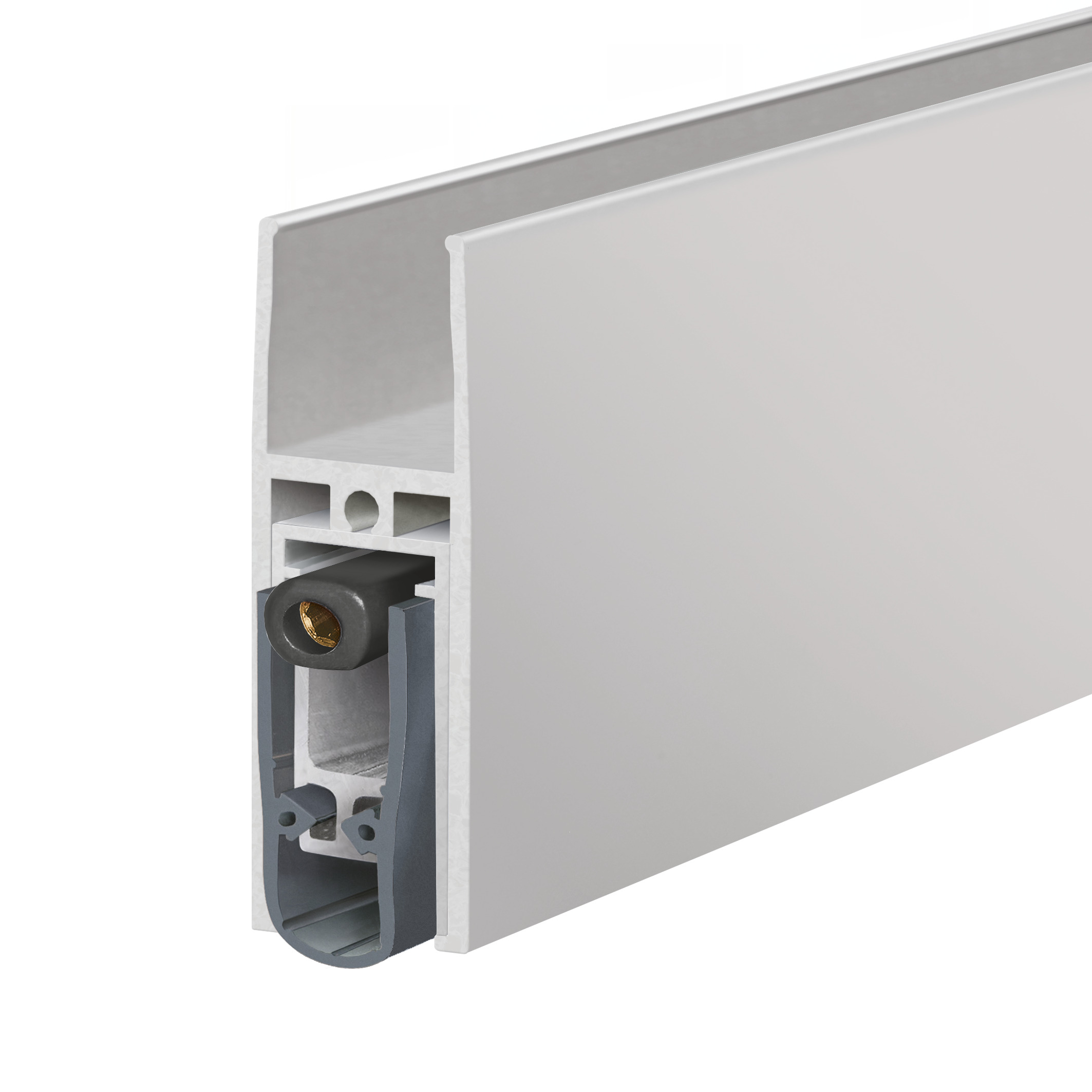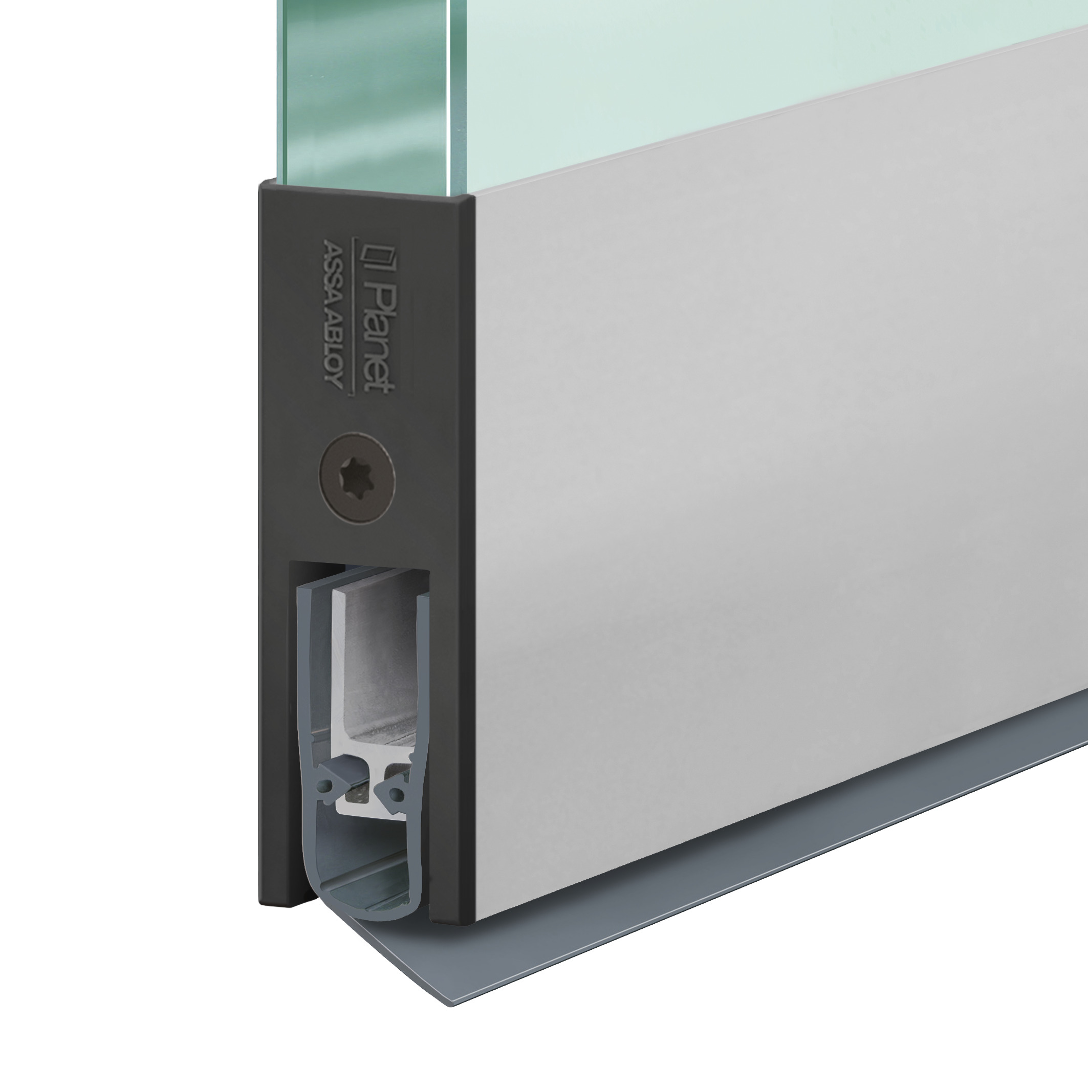 Automatische Türabsenkdichtung Planet KG-F12s FH+RD | 48 dB, geeignet für feuer- und rauchhemmende Türen, einseitige Auslösung mit Parallelabsenkung und automatischem Ausgleich bei schiefem Boden, Schutzprofil in EV1 farblos, Edelstahl matt oder schwarz C35 matt eloxiert, zum Aufstecken und Kleben, Dichtungshöhe bis 18 mm. Lippe aus selbstverlöschendem Silikon. Schutzprofil und Profil aus Aluminium 16,5 x 46 mm, inkl. Abdeckplatten.