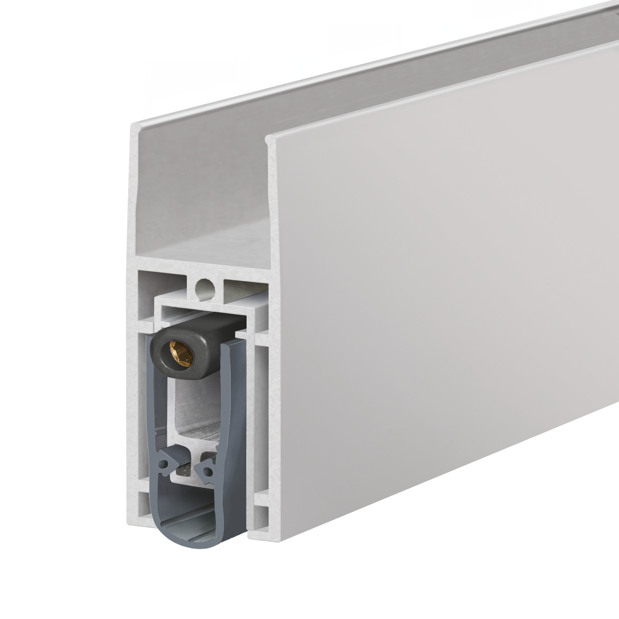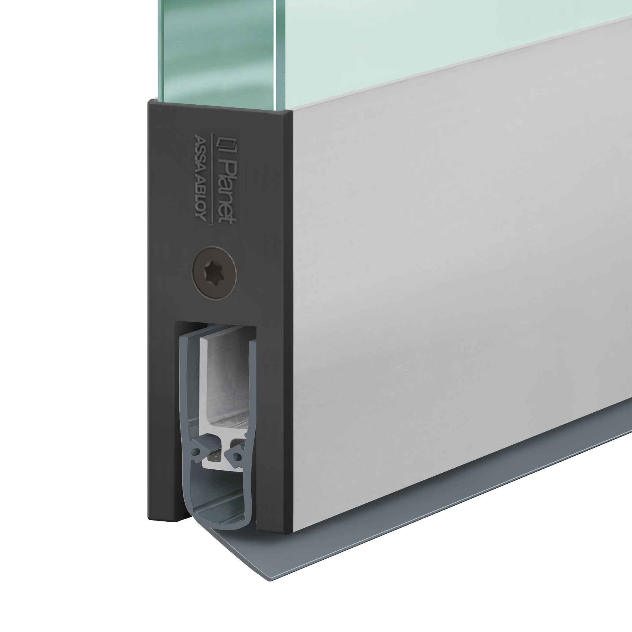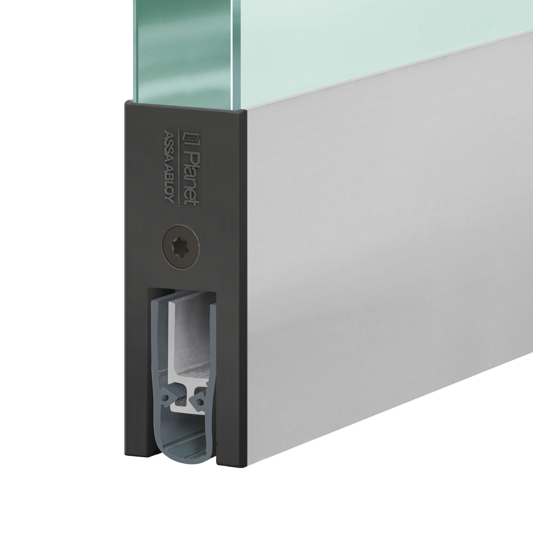 Automatische Türabsenkdichtung Planet KG-F16s FH+RD | 48 dB, geeignet für feuer- und rauchhemmende Türen, einseitige Auslösung mit Parallelabsenkung und auto­matischem Ausgleich bei schiefem Boden, Schutzprofil in EV1 farblos, Edelstahl matt oder schwarz C35 matt eloxiert, zum Aufstecken und Kleben, Dichtungshöhe bis 18 mm. Lippe aus selbstverlöschendem Silikon. Schutzprofil und Profil aus Aluminium 19,5 x 46 mm, inkl. Abdeckplatten.